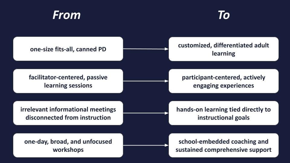 Education is not a static endeavor. Research evolves, young people change, political contexts shift, and the world keeps moving. As a result, we aim to ensure that educators have meaningful opportunities to learn, practice, and integrate new practices into their work in the service of effective learner-centered instruction.